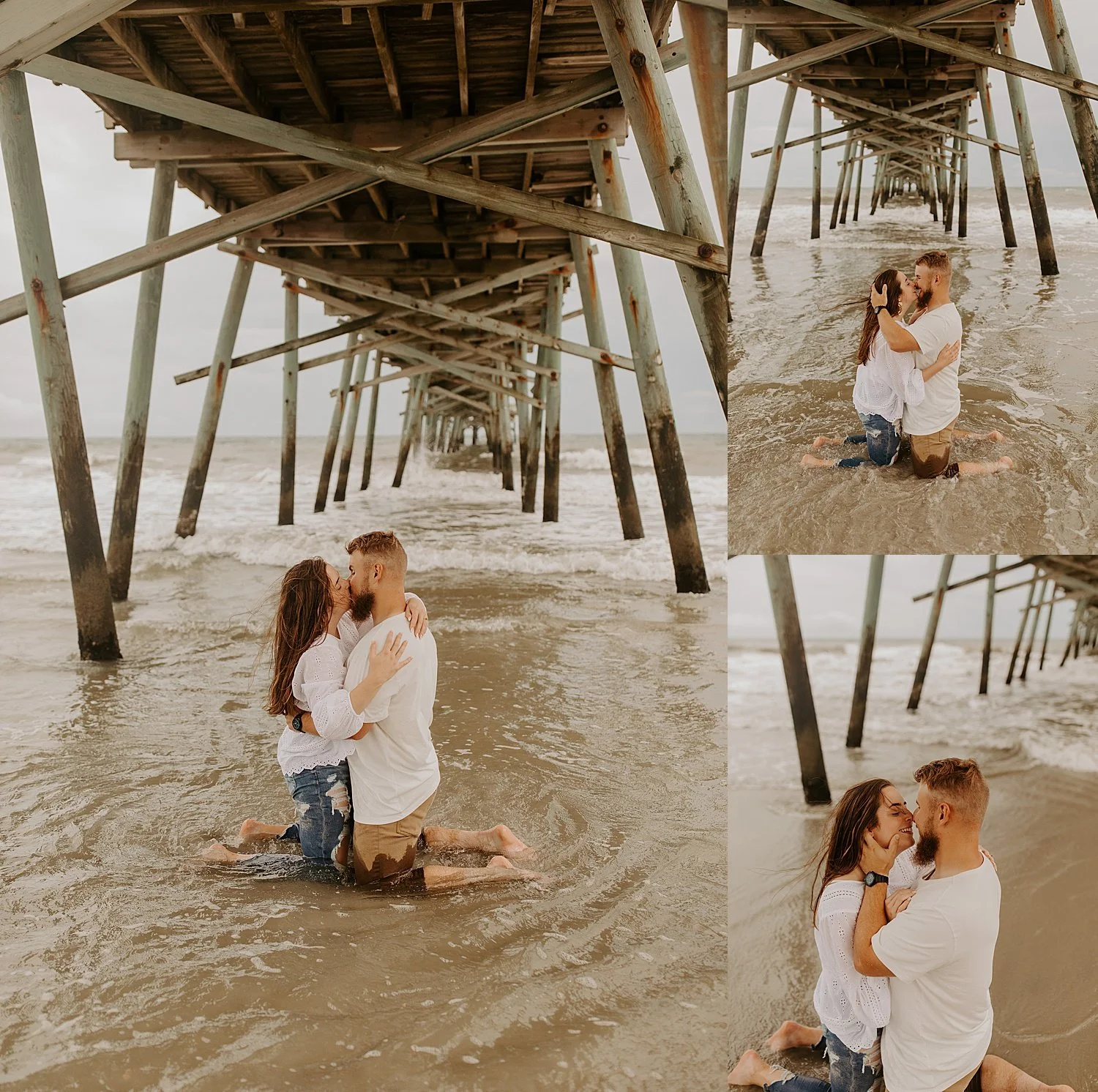 During their engagement session at Atlantic Beach, I got to get to know them even more and see how playful and silly they are together! During their session, they really had a ton of fun with the prompts and made them their own. Adding in extra long hugs, little kisses, and silly things to make each other laugh through the whole thing. I had such an amazing evening with these two running up and down the sandy shores of this little North Carolina Beach, splashing through the water, and doing our best to beat out the rain on this cloudy day (which we succeeded!). I seriously can’t wait for more laughs with these two on their wedding day!