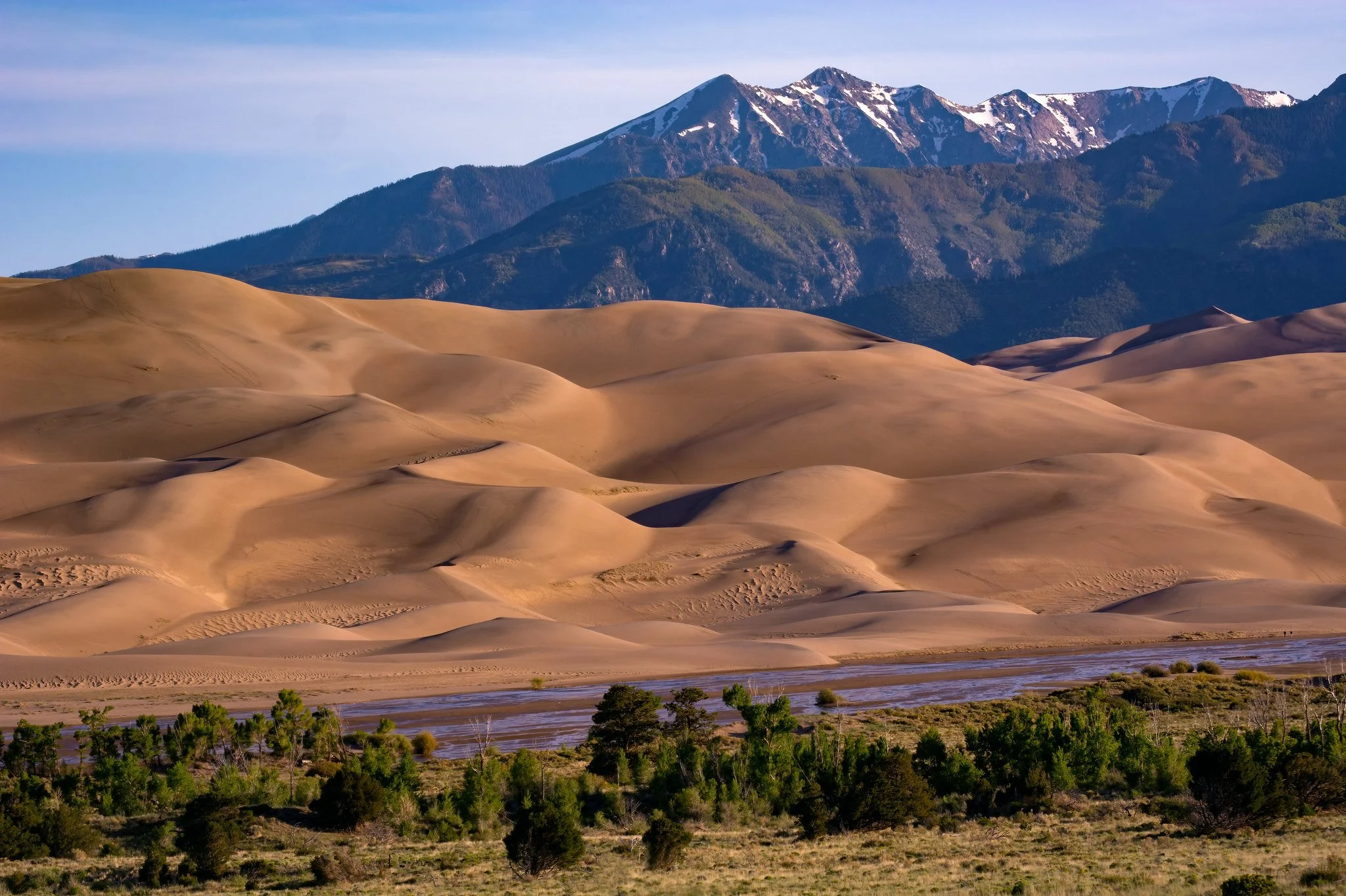During late spring and early summer, snowmelt from the surrounding mountains creates Medano Creek, a shallow stream that flows across the base of the dunes.