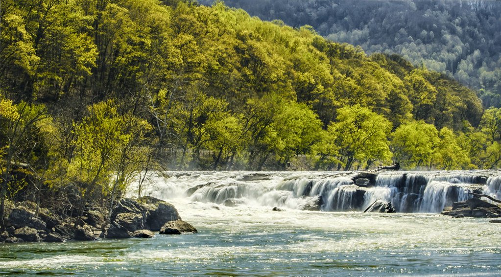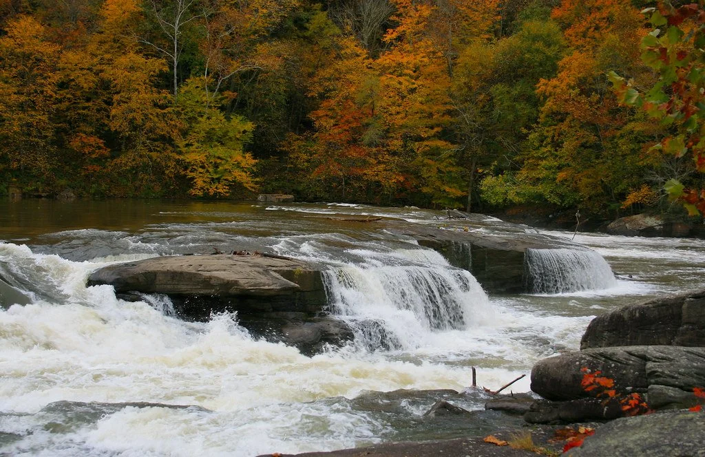 Sandstone Falls sits within New River Gorge National Park and Preserve and is the largest waterfall on the New River. Instead of a single vertical drop, the river spreads across a wide series of cascading channels that stretch nearly 1,500 feet across the river.